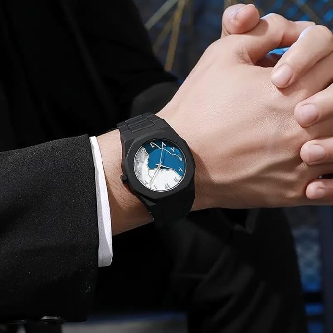 The Black Arabic Aura Watch for Men brings a new style that perfectly blends modern design with timeless Arabic elegance. Its dial features two rich colors — royal blue and white — with refined silver typography, giving it a bold yet classy appearance.